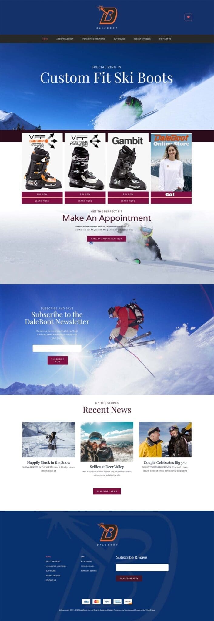Daleboot makes ski boots, and custom fits them for every skier, regardless of ability or physical limitation. Known as the “holy grail” in the skiing industry, Daleboot, with headquarters in Salt Lake City and Kitzbuhel, Austria, is famous among professionals, olympic skiers, and x-games gold medalists. SuperPage built the first comprehensive web presence for DaleBoot. We designed the site and online store, professionally photographing dozens of objects, from ski boot models to replacement parts. We set up secure partner pages for DaleBoot resellers worldwide. We created videos on the fitting process and canting (click images below). And for a diversion, we created a holy grail clip, and several tongue-in-cheek t-shirts, popular, in turns out, among skiers.