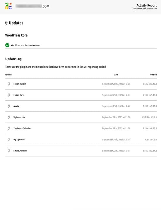 • Update Log – These are the plugin and theme updates that have been performed in the last reporting period. Note that in addition to Pro Plugins and Avada theme updates, all plugins on your site will have been updated – no need for you to manually update your specific plugins.